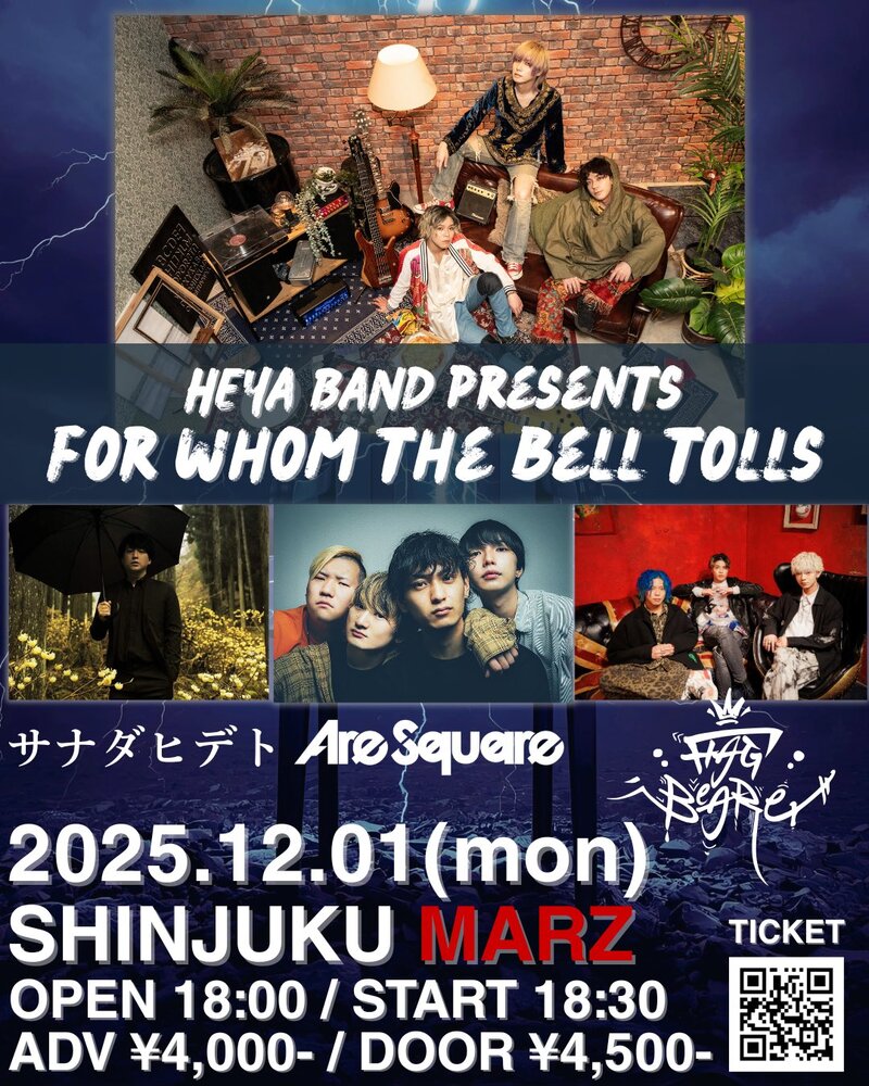 HEYA BAND presents for whom the bell tolls SCHEDULE 2025/12/01(月) 新宿MARZ 【⚡️LIVE INFORMATION ⚡️】 HEYA BAND presentsfor whom the bell tolls12/01(月) @新宿MARZ開場18:00/開演18:30前売り¥4,000-/当日¥4,500-(D代別) Act:部屋BAND/Are Square/flagbearer/サナダヒデト TICKET🎫 URLをコピーする 報告する
